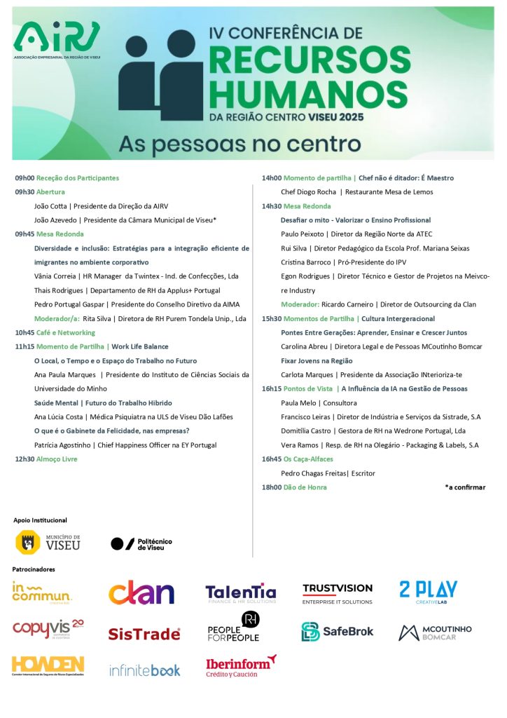 O programa promete um dia de «inspiração, partilha e debate sobre os grandes desafios e tendências que moldam o futuro da gestão de pessoas — desde a influência da Inteligência Artificial até à humanização das organizações».