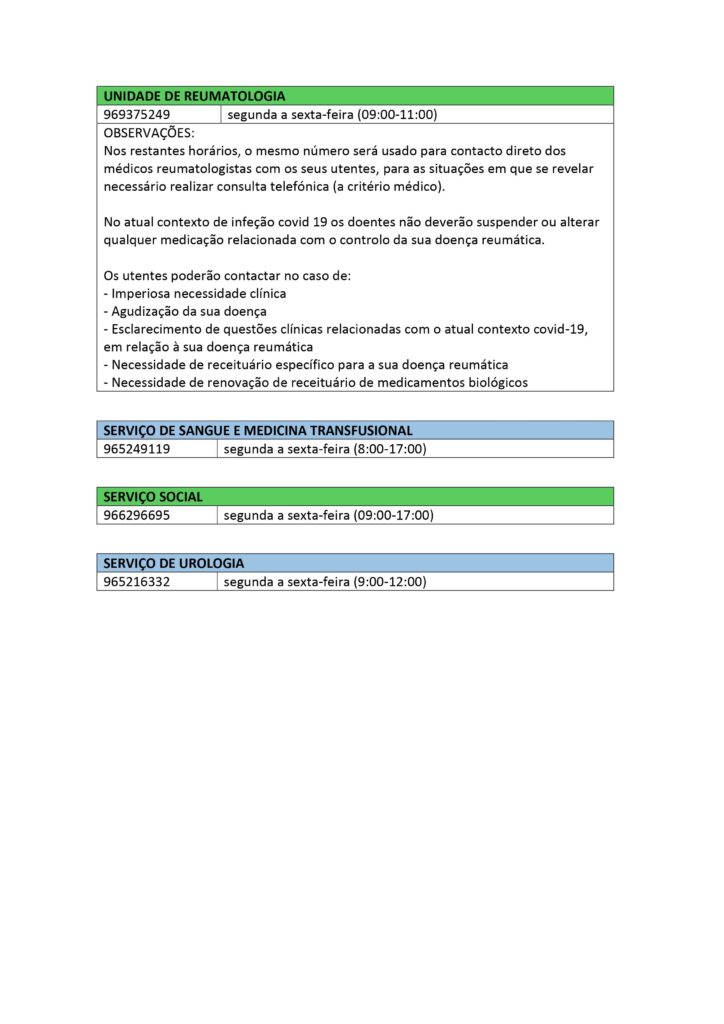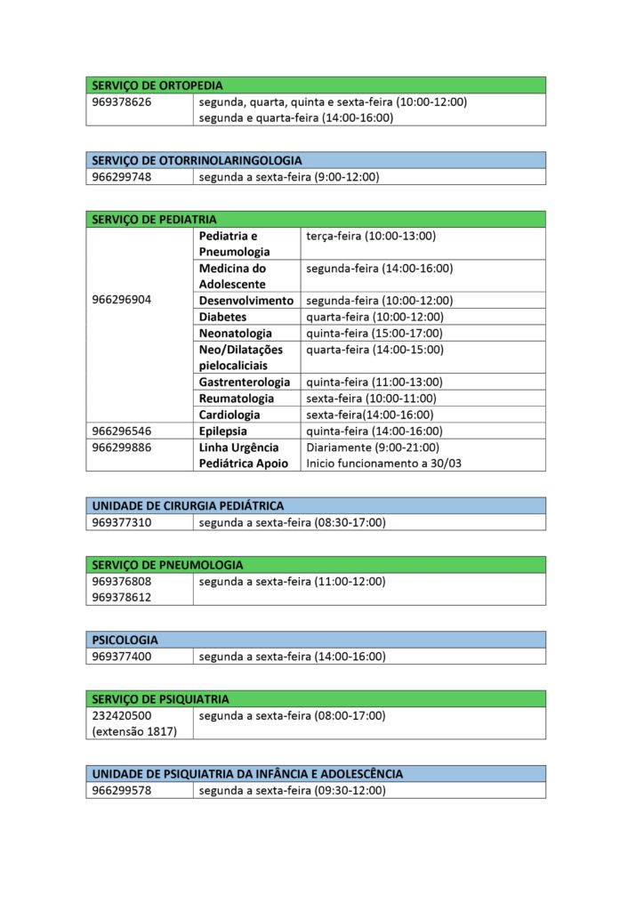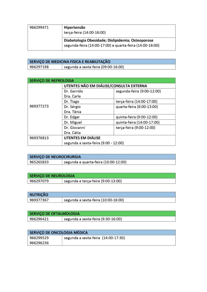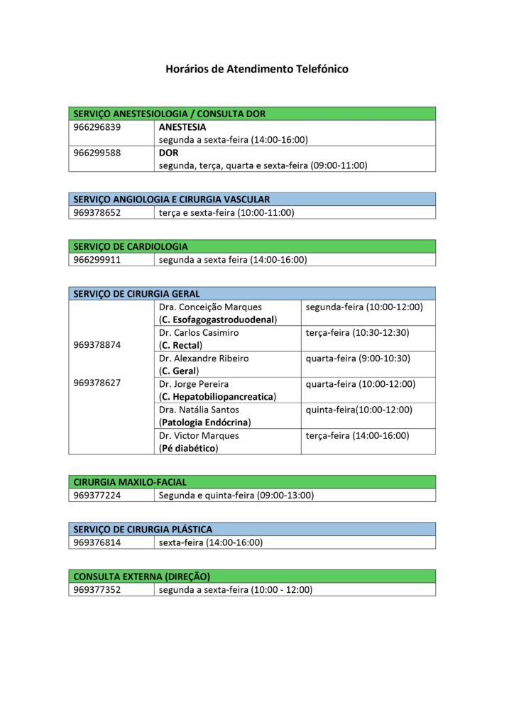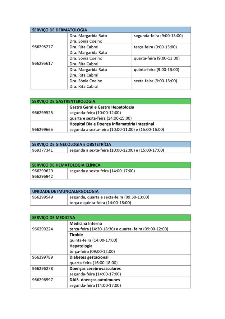Pode verificar em baixo, os contactos telefónicos de cada especialidade, assim como o horário.