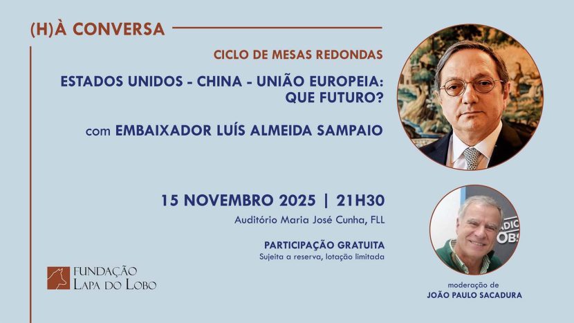 No próximo sábado, 15 de novembro, pelas 21h3, a Fundação Lapa do Lobo dá continuidade ao seu ciclo de mesas redondas com o tema “Estados Unidos – China – União Europeia: QUE FUTURO?”, com a presença do embaixador Luís Almeida Sampaio. O evento será moderado por João Paulo Sacadura e contará com uma análise sobre o atual contexto geopolítico global, a partir da experiência e perspetiva do embaixador. O encontro, com a duração de 90 minutos e entrada gratuita, acontece no Auditório Maria José Cunha, com a lotação de 80 lugares.