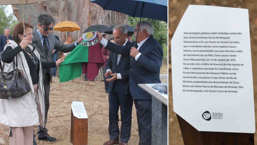 Na placa comemorativa pode se ler: “Este Eucalyptus globulus Labill. simboliza o amor dos pais, Dona Constança Garcia de Mesquita Mascarenhas e Dr. Luiz Xavier do Amaral Carvalho, que o mandaram plantar, como espécie única e exótica, numa propriedade sua, para eternizar a data de nascimento de sua filha, Dona Leonor Xavier Garcia Mascarenhas, em 16 de Janeiro de 1870. De acordo com o Diário do Governo de 4 de Agosto de 1964, o majestoso exemplar foi classificado como Árvore Monumental de Interesse Público sendo reconhecida a sua posse à Casa Xavier de Rio de Moinhos, propriedade dos descendentes de Dona Maria José Xavier Garcia de Menezes de Almeida, filha da homenageada, e do Doutor Lúcio de Almeida.”